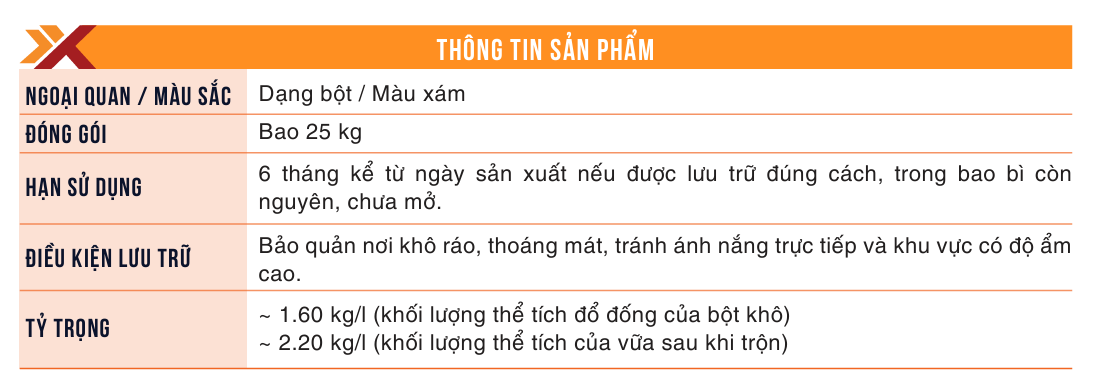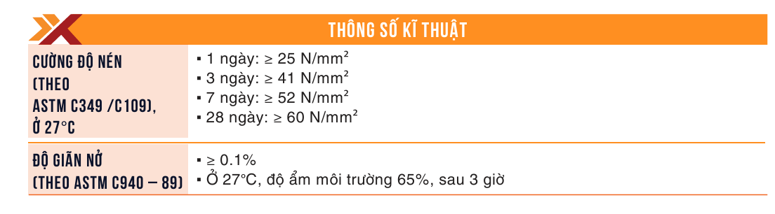 Luôn luôn đúc mẫu thử tại công trường để kiểm tra tính tương thích trước khi thi công chính thức. Vui lòng tham khảo Tài Liệu Kỹ Thuật mới nhất của sản phẩm để cập nhật thông tin chi tiết và chính xác nhất.