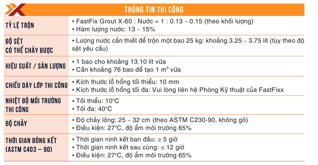- FastFix Grout X-60 : Nước = 1 : 0.13 – 0.15 (theo khối lượng)