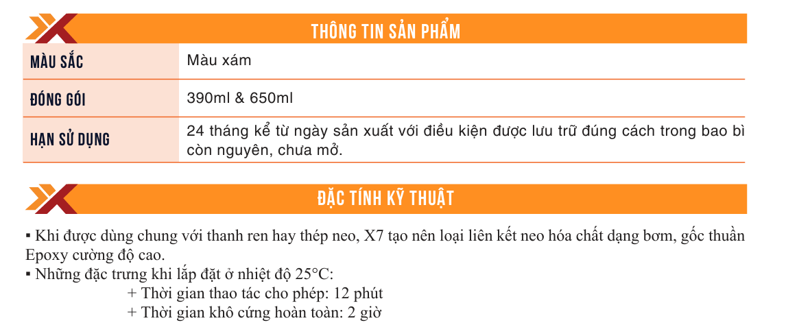 FASTFIX X7 Là loại keo khoan cấy gốc Epoxy chịu tải trọng cao, khô cứng nhanh và thời gian thao tác được gia tăng, thích hợp cho vùng khí hậu nhiệt đới. Làm việc tốt khi lắp đặt trong lỗ khô, ẩm, ướt và ngập nước
